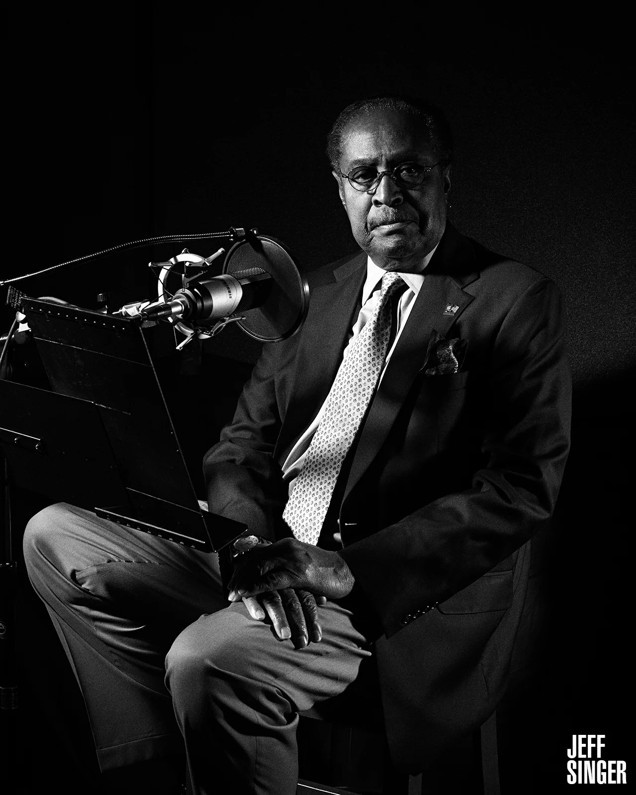 The initial shoot took place in a small recording studio on the USF campus. This is where the magazine wanted the shoot done. The recording studio was a very small room with nothing in it but a chair, a microphone and sound baffling on the wall. There was little room for the much needed lighting I had brought and what did fit couldn't be placed where I would have preferred. To make things more interesting, because the magazine wanted a "wide shot" of Dr. Jones, the room was so small I had to be in a completely different room shooting through a glass window. This meant I only had a couple of angles available to me due to reflections showing up in the final picture.